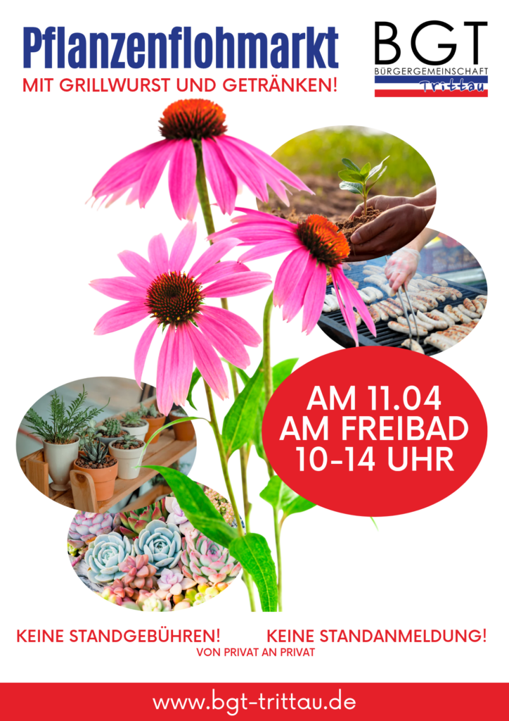 Die BGT Bürgergemeinschaft Trittau lädt ein zum Pflanzenflohmarkt! Mit Grillwurst, Getränken und Kuchen. Von 10.00 – 14.00 Uhr (Aufbau ab 08.00 Uhr möglich). Auf dem Schützenplatz / Vor dem Freibad. Kaufen, Verkaufen, Tauschen, Informieren. Von privat an privat (keine gewerblichen Aussteller). Keine Standgebühr, keine Standanmeldung notwendig! Kommt vorbei, auch ohne grünen Daumen Klönschnack mit der […]